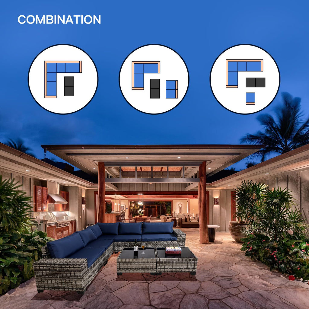 •【Flexible Combination】This patio sofa sectional sets are including, 2 corner chairs, 4 armless chairs, 2 glass coffee table. This moveable design allows it to adjust a required combination and change to different shapes for seating or lying.